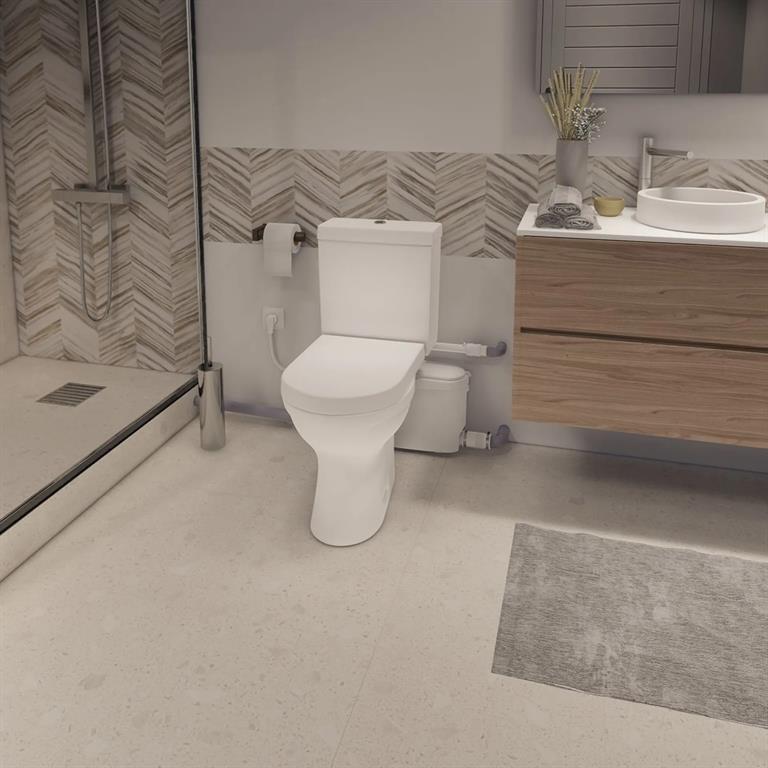 Sanibest Pro is a heavy duty macerator suitable for heavy usage public or commercial environments. Handles connection to a WC, basin, bidet and shower.